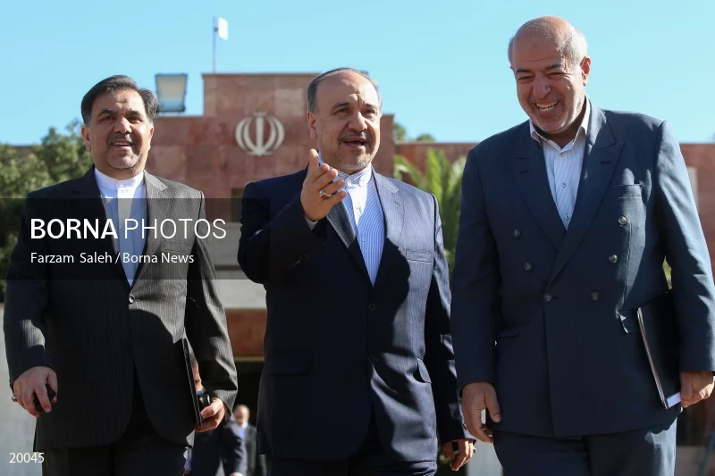 یکشنبه 17 مرداد 1395 ، ایران ، تهرانحمید چیتچیان وزیر نیرو (راست)، مسعود سلطانیفر رئیس سازمان میراث فرهنگی، صنایع دستی و گردشگری (راست) و عباس آخوندی وزیر راه و شهرسازی (چپ) در مراسم بدرقه رسمی رییس جمهور حسن روحانی در سفر به کشور آذربایجان در فرودگاه مهرآباد تهران دیده میشوند. حسن روحانی رئیس جمهور به منظور شرکت در اجلاس سه جانبه ایران، روسیه و جمهوری آذربایجان تهران را به مقصد باکو ترک کرد.