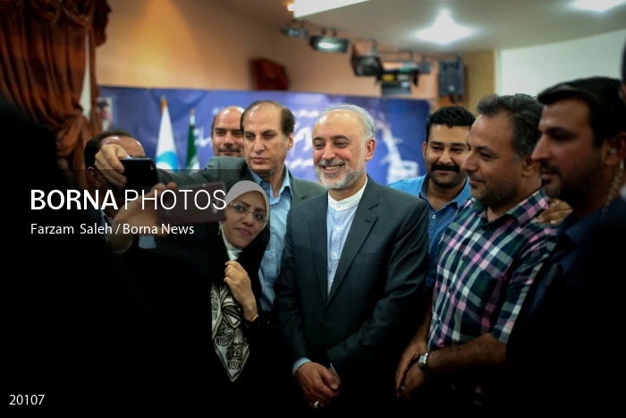 دوشنبه 18 مرداد 1395 ، ایران ، تهرانعلیاکبر صالحی معاون رئیس جمهور و رئیس سازمان انرژی اتمی ایران پس از نشستی با خبرنگاران به مناسبت روز خبرنگار با آنها عکس یادگاری میگیرد.