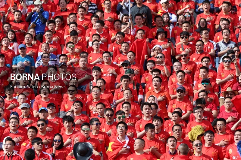 سه شنبه 8 فروردین 1396 ، ایران ، تهرانطرفداران تیم ملی فوتبال چین پیش از آغاز بازی مقابل ایران سرود ملی این کشور را میخوانند. تیم های ملی فوتبال ایران و چین در دور برگشت مقدماتی جام جهانی ۲۰۱۸ روسیه در ورزشگاه آزادی با قضاوت محمد تاکی از سنگاپور به مصاف هم رفتند و ایران موفق شد در این بازی با نتیجه 1 بر 0 پیروز شود. تک گل ایران در این بازی را مهدی طارمی در دقیقه ۴۶ به ثمر رساند.