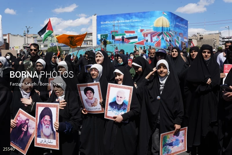 شرکت‌کنندگان در راهپیمایی روز جهانی قدس در آخرین جمعه ماه رمضان در تهران دیده می‌شوند. روز قدس یک رویداد سالانه است که در آخرین جمعه ماه رمضان به منظور ابراز حمایت از فلسطینیان و مخالفت با صهیونیسم و اسرائیل برگزار می‌شود.
