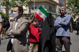 شرکت‌کنندگان در راهپیمایی روز جهانی قدس در آخرین جمعه ماه رمضان در تهران دیده می‌شوند. روز قدس یک رویداد سالانه است که در آخرین جمعه ماه رمضان به منظور ابراز حمایت از فلسطینیان و مخالفت با صهیونیسم و اسرائیل برگزار می‌شود.