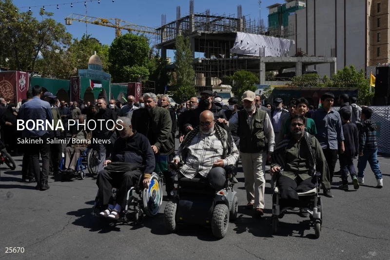 شرکت‌کنندگان در راهپیمایی روز جهانی قدس در آخرین جمعه ماه رمضان در تهران دیده می‌شوند. روز قدس یک رویداد سالانه است که در آخرین جمعه ماه رمضان به منظور ابراز حمایت از فلسطینیان و مخالفت با صهیونیسم و اسرائیل برگزار می‌شود.