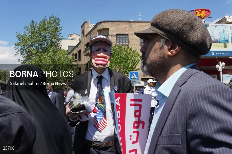 شرکت‌کنندگان در راهپیمایی روز جهانی قدس در آخرین جمعه ماه رمضان در تهران دیده می‌شوند. روز قدس یک رویداد سالانه است که در آخرین جمعه ماه رمضان به منظور ابراز حمایت از فلسطینیان و مخالفت با صهیونیسم و اسرائیل برگزار می‌شود.