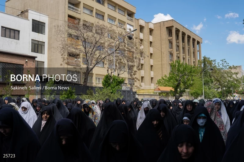 شرکت‌کنندگان در راهپیمایی روز جهانی قدس در آخرین جمعه ماه رمضان در تهران دیده می‌شوند. روز قدس یک رویداد سالانه است که در آخرین جمعه ماه رمضان به منظور ابراز حمایت از فلسطینیان و مخالفت با صهیونیسم و اسرائیل برگزار می‌شود.