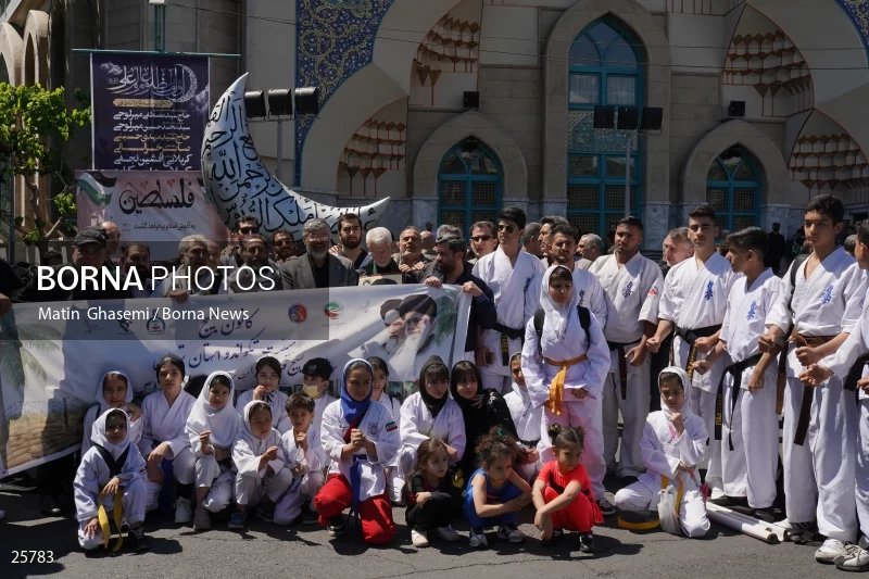 شرکت‌کنندگان در راهپیمایی روز جهانی قدس در آخرین جمعه ماه رمضان در تهران دیده می‌شوند. روز قدس یک رویداد سالانه است که در آخرین جمعه ماه رمضان به منظور ابراز حمایت از فلسطینیان و مخالفت با صهیونیسم و اسرائیل برگزار می‌شود.