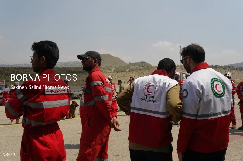 اعضای جمعیت جمعیت هلال احمر ایران در مانور بزرگ امداد و نجات در فرودگاه سپهر شرکت می‌کنند.