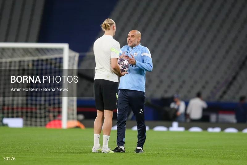پپ گواردیولا سرمربی تیم منچستر سیتی در آخرین تمرین این تیم پیش از برگزاری مسابقه فینال لیگ قهرمانان اروپا مقابل اینترمیلان در استادیوم آتاتورک استانبول بازیکنان را هدایت می‌کند.