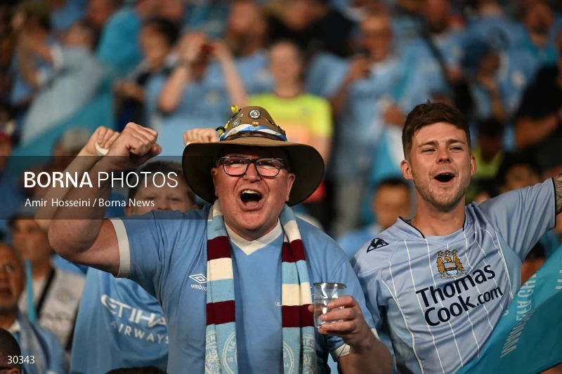 هواداران فوتبال در جریان دیدار تیمهای منچسترسیتی و اینترمیلان در فینال لیگ قهرمانان اروپا در استادیوم آتاتورک المپیک استانبول دیده می‌شوند.